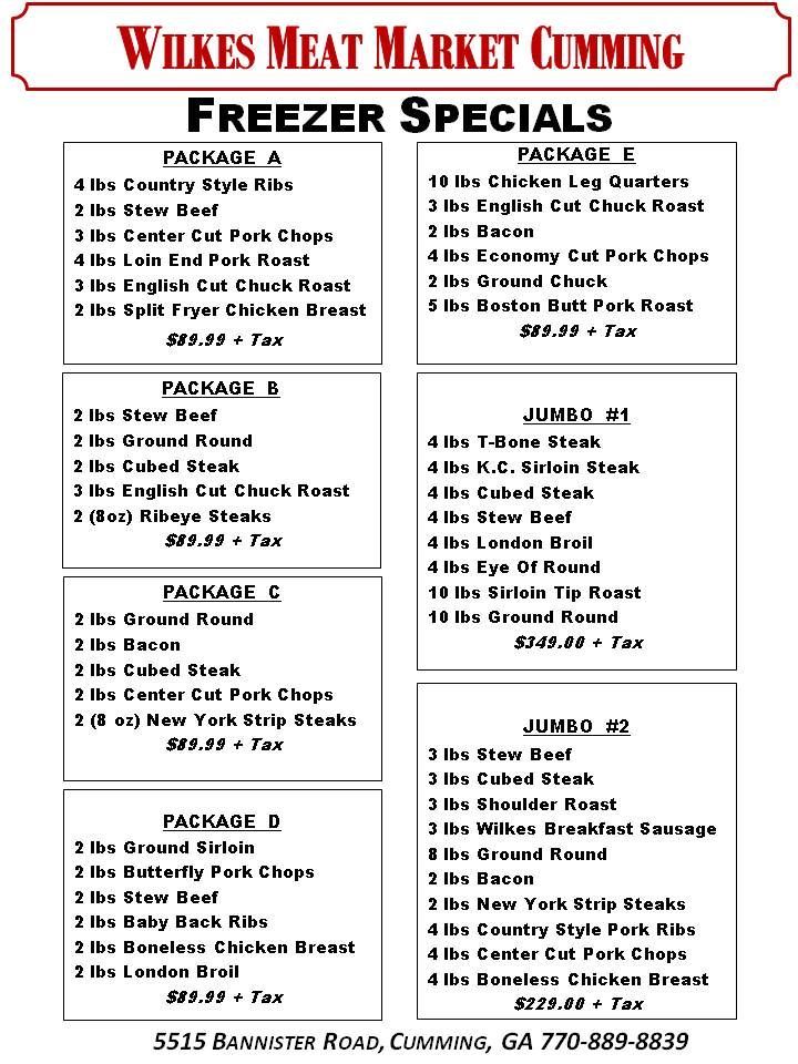 At Wilkes Meat Market Of Cumming, we're excited to offer an array of money-saving meat freezer specials. Perfect for stocking up your freezer, our specials provide fantastic value without compromising on quality. To ensure we can serve you efficiently, we ask that you call us in advance to prepare your order. Whether you're planning a family barbecue, a special dinner, or just ensuring you have quality meats on hand, our freezer specials are tailored to suit your needs.